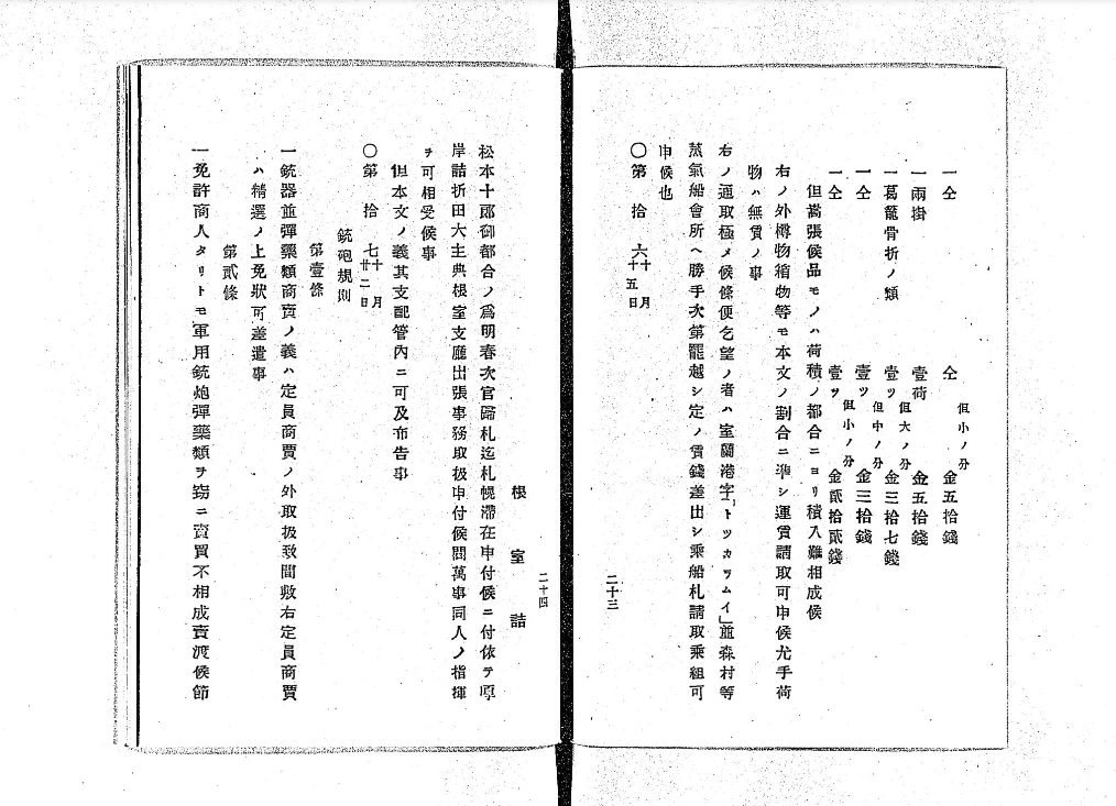 | 第1条 | 一 銃器並弾薬類商売ノ義ハ定員商売ノ外取扱致間敷右定員商売ハ精選ノ上免状可差遣事 | 銃器・弾薬類を販売するにあたっては、「定員商売」以外は行なうべきではない。「定員商売」であっても、よく見極めて業者を選び、販売許可免状を発給すること。 |